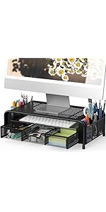 • Reduce neck/back strain by elevating your monitors while organizing your office supplies.